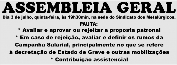 Assembleia Geral definirá os rumos da campanha salarial 2014 Após a assembleia, será realizado o sorteio do confederativo 02/07/2014 Stimepa ![]() Nesta quinta-feira, 3 de julho, os trabalhadores decidem se aceitam ou não a proposta patronal, caso rejeitada, também s Companheiros(as), Chegou a hora de votar a proposta patronal e decidir os rumos de nossa campanha salarial 2014, venha participar da assembleia que acontece nesta quinta-feira, dia 3 de julho, às 19h30min na sede do Sindicato dos Metalúrgicos na avenida Francisco Trein 116, Porto Alegre. Após a assembleia, será realizado o sorteio do confederativo.