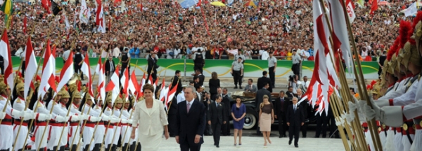Antes de deixarem o Congresso, mas já na área externa, eles acompanharam mais uma vez a execução do Hino Nacional pelo Batalhão da Guarda Presidencial e a salva de 21 tiros. A presidenta passou a tropa em revista e, só então, seguiu no Rolls-Royce para o Palácio do Planalto, onde a presidente passou em revista as tropas da Marinha, Exército e Aeronáutica.