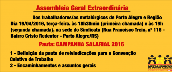 Assembleia Geral Extraordinária . 11/04/2016 ![]() Dia 19/04/2016, terça-feira, às 18h30min (primeira chamada) e às 19h (segunda chamada) Dos trabalhadores/as metalúrgicos de Porto Alegre e Região. Pauta: CAMPANHA SALARIAL 2016 Veja também |
