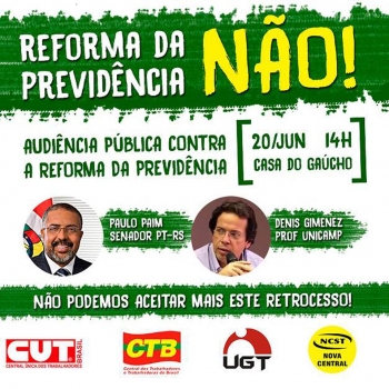 Audiência pública contra reforma na previdência acontecerá na próxima semana Reunião contará com a presença do senador Paulo Paim 14/06/2016 ![]() Na próxima segunda-feira, dia 20 de junho, às 14h, na Casa do Gaúcho, as centrais sindicais estão promovendo uma Audiência Pública com o senador Paulo Paim e o economista e professor da Unicamp, Denis Gimenez, especialista em Previdência Social, que explicarão por que a reforma que está tramitando é danosa aos trabalhadores, principalmente os mais pobres. Este debate é muito importante. A Classe Trabalhadora não pode permitir os retrocessos no regime da previdência propostos pelo governo ilegítimo de Michel Temer. Se você não puder participar, convide seus amigos, vizinhos e parentes. É o futuro de todos nós que está em jogo. Veja também |