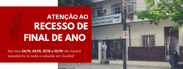 RECESSO DE FINAL DE ANO! . 17/12/2018 ![]() Confira datas Em virtude dos feriados de Natal e Ano Novo, não haverá expediente na sede e subsede em Guaíba nos dias 24/12, 25/12, 31/12 e 01/01. No dia 02 de janeiro o atendimento será normalizado. Confira as datas de recesso da assessoria jurídica. Veja também |