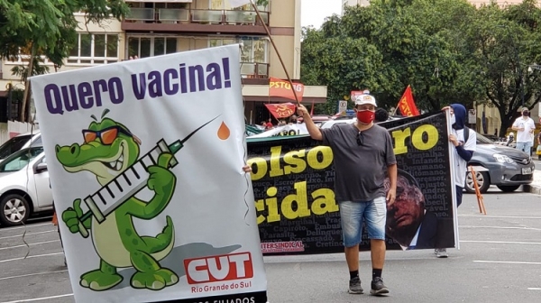 Ato da CUT-RS e centrais em frente ao Piratini defende lockdown pela vida O protesto fez parte do Dia Nacional de Luta em Defesa da Vida, da Vacina, do Emprego e do Auxílio emergencial de R$ 600" 25/03/2021 ![]() A defesa de um lockdown pela vida marcou o ato simbólico da CUT-RS, centrais sindicais, CPERS e movimentos sociais, no final da manhã desta quarta-feira (24/03), em frente ao Palácio Piratini, no centro de Porto Alegre. Usando máscaras de proteção, passando álcool em gel e respeitando o distanciamento sanitário, dirigentes sindicais e ativistas sociais denunciaram a política de morte do presidente Jair Bolsonaro (ex-PSL), as 300 mil mortes de brasileiros e brasileiras na pandemia do coronavírus, o colapso da saúde, a falta de vacinas para imunizar a população e a irresponsabilidade do governador Eduardo Leite (PSDB) e de vários prefeitos, como o de Porto Alegre, Sebastião Melo (MDB), que flexibilizaram as restrições da bandeira preta para vermelha, aumentando o risco de contaminação. O protesto fez parte do “Dia Nacional de Luta em Defesa da Vida, da Vacina, do Emprego e do Auxílio emergencial de R$ 600”, e ocorreu após manifestações em passarelas e viadutos na Capital e no Interior nas primeiras horas da manhã. Várias faixas e cartazes foram estendidos com dizeres de “vacina já para todos e todas”, “auxílio emergencial”, “lockdown já” e “Fora Bolsonaro”. Governo genocida Para o presidente da CUT-RS, Amarildo Cenci, infelizmente estamos diante de um governo genocida que não está preocupado com a vida do trabalhador brasileiro. “Estamos aqui para afirmar o nosso posicionamento em defesa da vida e de vacina já para todos e todas”, afirmou. Ele defendeu que somente com saúde será possível melhorar a situação econômica que estamos passando. “Não tem economia sem pessoas protegidas. Só com saúde e vida garantida. Teremos essa realidade com vacina, com auxílio emergencial de R$ 600, com serviço público valorizado e com emprego e renda”, disse. Não queremos mais mortes Também participaram entidades que representam os trabalhadores e as trabalhadoras da educação, que conseguiram uma liminar que suspendeu as aulas presenciais na pandemia. “Estamos aqui para dizer ao governador que é necessário fazer lockdown de 14 dias no estado. Todos os cientistas têm dito que para conter o vírus é preciso diminuir a circulação de pessoas”, enfatizou a presidente do CPERS Sindicato, Helenir Aguiar Schürer. A professora ressaltou que o governo estadual precisa ouvir a voz dos trabalhadores e dos cientistas. “Pedimos para que Eduardo Leite escute a ciência e não os empresários”, disse. “Para os empresários, se um trabalhador morre, eles contratam outro. Nós não queremos mais mortes. Não é hora de abrir o comércio, é hora de parar o estado”, completou Helenir, preocupada com mais de 800 mil infectados e quase 18 mil mortes no RS em função da Covid-19. “O governador precisa se mexer. Não é possível que continue confiando no calendário de imunização ao governo Bolsonaro. Ele também tem autorização para comprar vacinas e conter essa tragédia que se abate sobre os gaúchos”, cobrou Helenir. O diretor da CUT-RS e do Sintrajufe-RS, Marcelo Carlini, criticou o descaso dos governos com os serviços públicos e a política nefasta de privatizações no auge da pandemia. Ele repudiou a aprovação da PEC 280, com os votos da bancada governista, na Comissão de Constituição e Justiça (CCJ) da Assembleia Legislativa, que acaba com o plebiscito para vender a Corsan, o Banrisul e a Procergs. “Quem quer privatizar a água e a energia do povo também é genocida. E é essa a proposta do governador para a Corsan e a CEEE”, comparou o dirigente sindical.