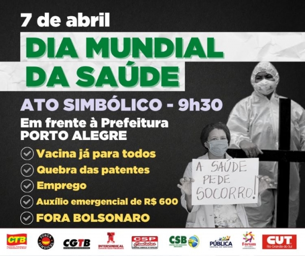 Manifestações de 7 de abril - Dia Mundial da Saúde CUT-RS e centrais no RS planejam manifestações para esta quarta 05/04/2021 ![]() A CUT-RS e as centrais sindicais no Rio Grande do Sul realizam na próxima quarta-feira, 7 de abril, uma série de manifestações para marcar o Dia Mundial da Saúde, cobrando dos governos vacina já para todos e todas, quebra de patentes, emprego e auxílio emergencial de R$ 600, além de reforçar a luta pelo Fora Bolsonaro. Usando máscaras e respeitando o distanciamento sanitário, a mobilização na Capital começará logo após o amanhecer, às 7h, com a exibição de faixas, cartazes e banners em viadutos e passarelas de várias ruas, avenidas e rodovias. Às 9h30, será realizado um ato simbólico em frente à Prefeitura de Porto Alegre, com cruzes e um caixão para simbolizar os mais de 300 mil brasileiros e brasileiras que morreram na pandemia e protestar contra o descaso das autoridades diante do colapso da saúde. No RS já são mais de 20 mil vidas perdidas. Haverá também manifestações em várias cidades do interior gaúcho, que estão sendo organizadas pelas centrais e movimentos sociais. Exigimos uma política em defesa da vida Para o presidente da CUT-RS, Amarildo Cenci, a passagem do Dia Mundial da Saúde é oportuna para exigir uma política em defesa da vida dos governos municipais, estaduais e federal. “Além da Covid-19, estamos sendo vítimas da política genocida de Bolsonaro, o que explica o ritmo lento da vacinação, a ausência de testagem em massa, a falta de leitos de UTI e o caos na saúde”, afirma. “Temos que nos reinventar para levantar a nossa voz em meio à pandemia para denunciar que milhares de famílias continuarão perdendo seus entes queridos por culpa da irresponsabilidade dos governos Bolsonaro, Eduardo Leite e Sebastião Melo, que não garantem vacinas para todos e todas, nem quebra de patentes, emprego e auxílio emergencial de R$ 600”, destaca Amarildo. Para o secretário de Saúde do Trabalhador da CUT-RS, Alfredo Gonçalves, é essencial garantir vacinação em massa. “Não podemos ficar indiferentes diante do adoecimento e a morte da população. Temos ciência e recursos disponíveis para implementar políticas públicas de proteção à vida de todas as pessoas”, enfatiza. Quebra de patentes é essencial A luta pela quebra de patentes é fundamental. “Não existe vacina no mercado para todo mundo. Não é só o Brasil que enfrenta problemas em relação a isso. O que o governo federal devia ter feito era o planejamento visando a imunização da população”, aponta a secretária nacional da Saúde do Trabalhador da CUT, Madalena Margarida da Silva, que participou na terça-feira (30/03), da reunião virtual do Coletivo Estadual de Saúde da CUT-RS. Ela ressalta que existe um movimento global que luta por vacina para todos e todas, quebra de patentes e defesa do emprego. “O conhecimento deve ser utilizado da forma mais democrática possível. Precisamos amplificar esse debate, fortalecer o combate à covid-19 e garantir proteção do emprego e da renda”, disse Madalena. Assista ao vídeo da CUT para o Dia Mundial de Saúde
