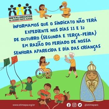 ATENÇÃO: Sindicato estará fechado nos dias 11 e 12 de Outubro em razão do feriado de Nossa Senhora Aparecida e Dia das Crianças Retornamos normalmente no dia 13, Quarta-feira a partir das 8h da manhã. 08/10/2021 ![]() Informamos que nos dias 11 e 12 de Outubro (segunda e terça-feira), não haverá expediente na sede do Sindicato em razão do feriado de Nossa Senhora Aparecida e Dia das Crianças. Retornamos normalmente no dia 13, Quarta-feira a partir das 8h da manhã. Veja também |