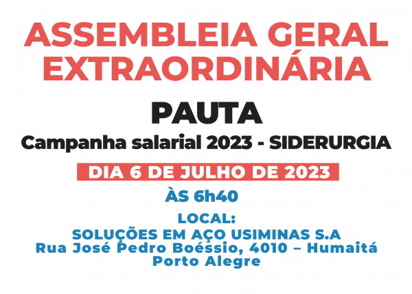 Participe da Assembleia para votação do reajuste da SIDERURGIA Os trabalhadores da SOLUÇÕES USIMINAS devem avaliar e votar a proposta para a convenção coletiva deste ano 05/07/2023 ![]() O SINDICATO DOS TRABALHADORES DAS INDÚSTRIAS METALÚRGICAS, MECÂNICAS E DE MATERIAL ELÉTRICO E ELETRÔNICO DA GRANDE PORTO ALEGRE, vem através desse, por seu presidente, CONVOCAR todos os integrantes da categoria profissional associados ou não da entidade, para a Assembleia Geral Extraordinária de Avaliação Campanha Salarial 2023, que será realizada na empresa SOLUÇÕES EM AÇO USIMINAS S.A, sito Rua José Pedro Boéssio, 4010 – Humaitá, Porto Alegre - RS, no próximo dia 06/07/2023 às 06h40 em primeira e única convocação, a fim deliberarem pela seguinte ORDEM DO DIA: