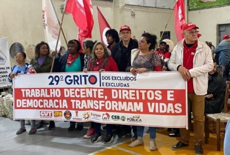 CUT-RS defende trabalho decente, direitos e democracia no Grito dos Excluídos Compareceram dirigentes sindicais de várias categorias, como metalúrgicos, bancários, sapateiros, petroleiros, professores e servidores públicos, dentre outras, bem como uma delegação do projeto CUT com a Comunidade. 12/09/2023 ![]() A previsão da volta das chuvas, após as enchentes que causaram 41 mortes e afetaram 79 municípios, deixando mais de 2.300 desabrigados e 3.900 desalojados no Rio Grande do Sul, segundo último balanço da Defesa Civil do Estado, suspendeu a caminhada do 29º Grito dos Excluídos e das Excluídas que seria promovida neste 7 de setembro, nas ruas de São Leopoldo, na Região Metropolitana de Porto Alegre.