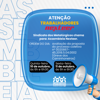 O Sindicato dos Metalúrgicos da Grande Porto Alegre (STIMEPA) convoca todos e todas para a Assembleia Nexteer. A pauta será a avaliação da proposta do processo coletivo nº 0020867-45.2018.5.04.0002, relacionado à Greve dos Caminhoneiros.